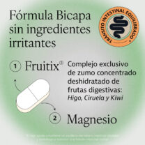 - FRUITIX® Y MAGNESIO: Laxofruit está formulado con una tecnología bicapa de magnesio y Fruitix® (Complejo exclusivo de zumo concentrado deshidratado de frutas digestivas: Higo, Ciruela y Kiwi).