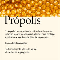 Maltodextrine, Agent de charge (sorbitol), Extrait sec de propolis (6% galangine), Arôme, Gluconate de zinc, Extrait sec de fleur de Sureau (Sambucus nigra) (0,3% isoquercitrosides), Extrait sec Erisimo ( em>Sisymbrium officinale) sommité fleurie (0,5% de glucosinolates), Antiagglomérant (sels de magnésium d'acides gras), Acidulant (acide tartrique), Huile essentielle d'Eucalyptus (Eucalyptus globulus), Huile essentielle de Thym (Thymus vulgaris), Édulcorant (glycosides de stéviol issus de la stévia), Cholécalciférol (Vitamine D3).