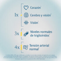 Contiene EPA y DHA, que contribuyen al funcionamiento normal del corazón. El efecto beneficioso se obtiene con una ingesta diaria de 250 mg de EPA y DHA.Contiene DHA, que contribuye a mantener el funcionamiento normal del cerebro y de la visión. El efecto beneficioso se obtiene con una ingesta diaria de 250 mg de DHA.